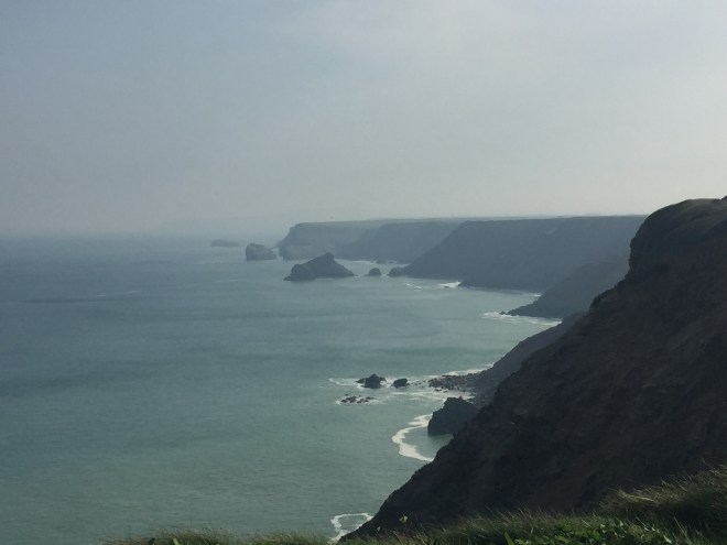 After Portreath the conditions underfoot deteriorated and the zawns came thick and fast. Even the word sounds kind of plungy. We don’t have a word in English for zawn, only in Cornish. This is because geological features of comparative fiendishness don’t exist anywhere else. There was one in particular which could easily have been avoided by an attractive-looking high-level curve around the top, but it was fenced off because it was MOD land. We might have considered climbing the fence to take a shortcut, had not a walker coming in the other direction explained his conspiracy theory to us that this was contaminated land from chemical experiments by the MOD. But we saw lots of active agricultural activity going on on the land, so I’m not sure that the conspiracy theory holds water.