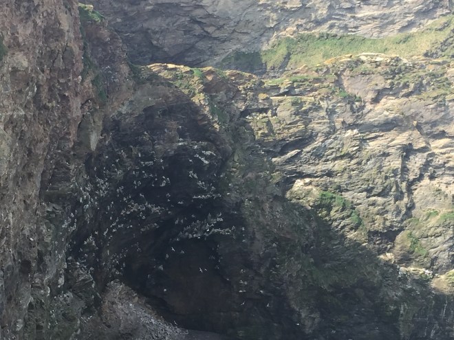 One rule of the walk is that whenever you see somebody with a pair of binoculars you have to ask them what they’re looking at because they are the people who know stuff. On the cliff above Portreath we met Mark from the British Trust for Ornithology. He was perched perilously close to the cliff edge with his tiny dog and larger bird-watching monocular, with which he was counting a cliff-face full of nesting pairs of kittiwakes. He let us look through the lens at a number of nests including one kittiwake from France (apparently you can tell by the bands on the ring on its legs. They have a code like naval flags). Stephen looked at four jackdaw chicks.