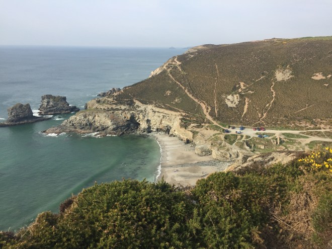 After Portreath the conditions underfoot deteriorated and the zawns came thick and fast. Even the word sounds kind of plungy. We don’t have a word in English for zawn, only in Cornish. This is because geological features of comparative fiendishness don’t exist anywhere else. There was one in particular which could easily have been avoided by an attractive-looking high-level curve around the top, but it was fenced off because it was MOD land. We might have considered climbing the fence to take a shortcut, had not a walker coming in the other direction explained his conspiracy theory to us that this was contaminated land from chemical experiments by the MOD. But we saw lots of active agricultural activity going on on the land, so I’m not sure that the conspiracy theory holds water.