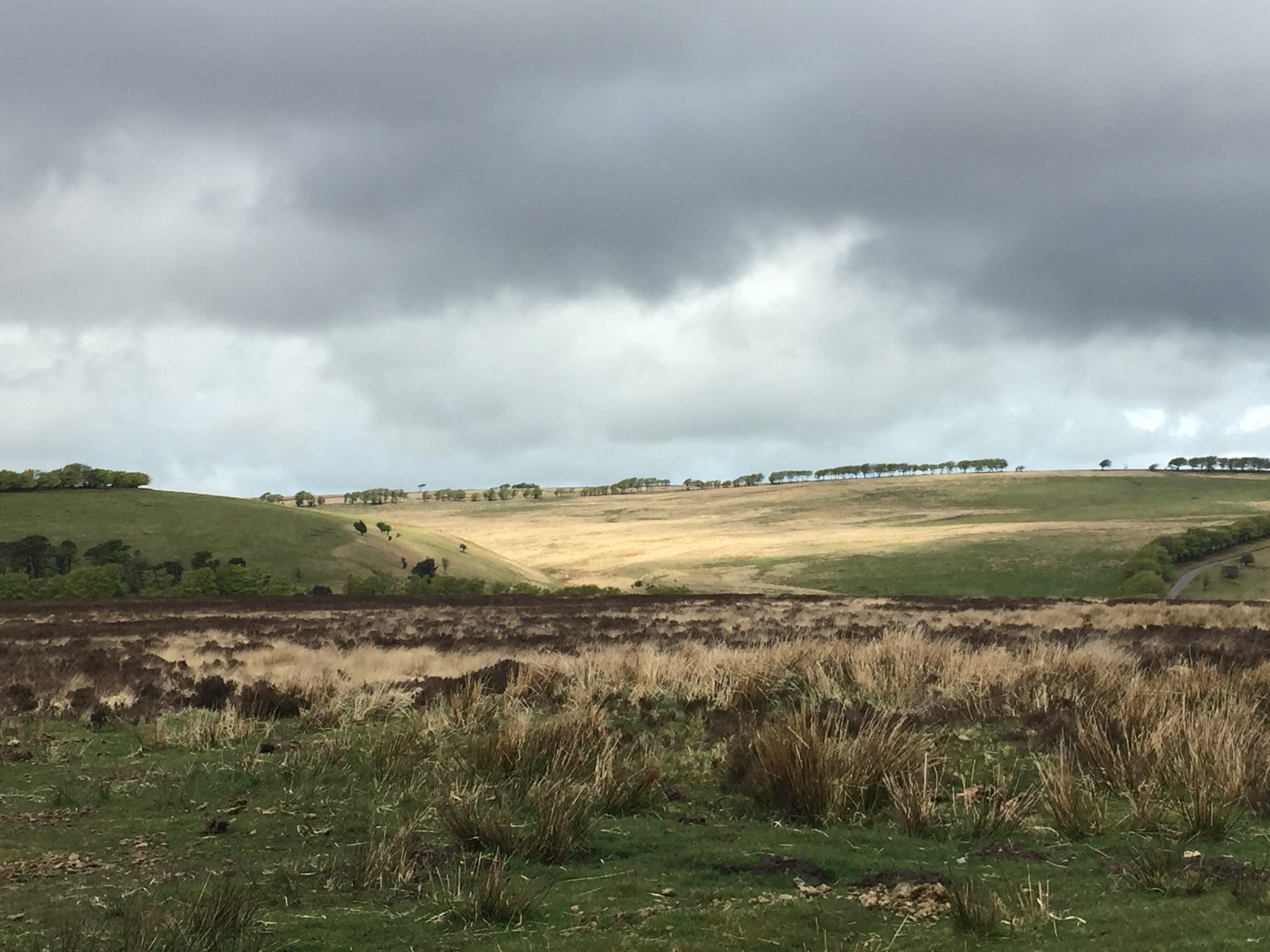We recalled the late snows that they had had on Exmoor, when people had been stranded in their cars on the motorway. It’s bleak up here, and although today there was no rain, a stiff wind was blowing and I wished I had not buried my gloves inaccessibly at the bottom of my pack. We encountered no walkers at all on the moors. We saw a fair number of local people, however: a farmer racing down the road on the other side of the valley on his 4×4, his dog tearing behind him, then a minute later coming up the track past us, dog in the back with tongue lolling.