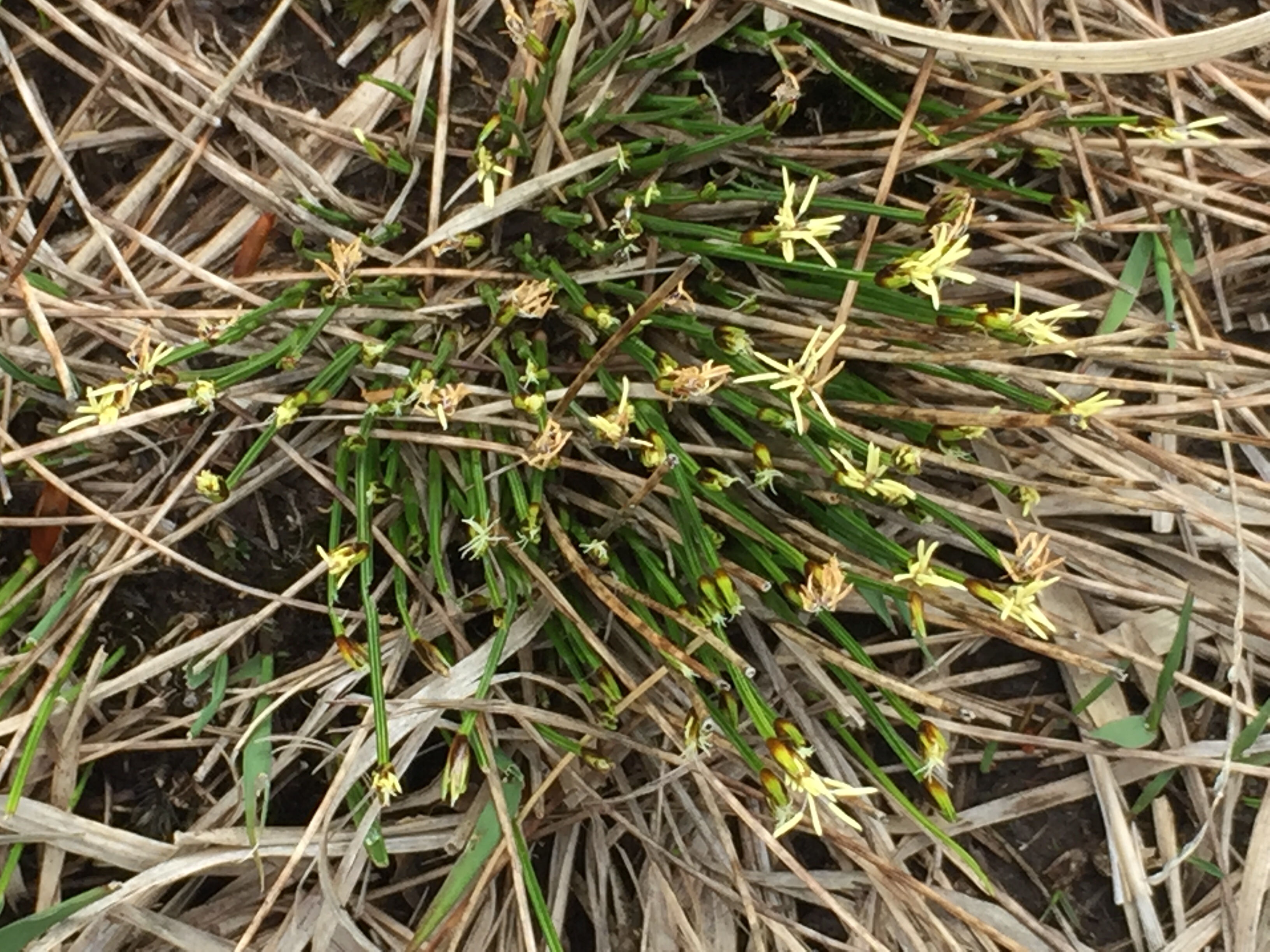Because of the prevalence of sheep and deer ticks on Exmoor, and especially because I have previously been infected with Lyme disease, we tucked our trousers into our socks and exercised Constant Vigilance. We were really looking forward to the Exmoor paths today. Perfect turf took us up through fresh air, chittering with swallows and martins around the farmhouse, up into the stratum of the larks on the high moors. Here we were at about 300m, with Dunkery Beacon at 519m in front of us. At this height, spring was about a fortnight behind. Not a peep yet out of the heathers. New green grass was just starting to poke through, but mostly the colours were the yellows and browns of autumn. The only flowers were minute rushes, low to the ground.