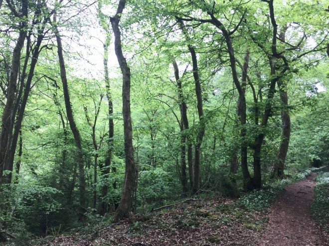 The woods were magnificent. They fall away steeply to the left hand side and are thick with mixed deciduous trees, but mainly beeches. They seem to have a different character here in the Marches to those on Exmoor: more graceful, more graceful, less battling against the elements. They look like dancing dryads. The understory was covered with wild garlic, creeping Jenny, sweet woodruff and just a few late windflowers.