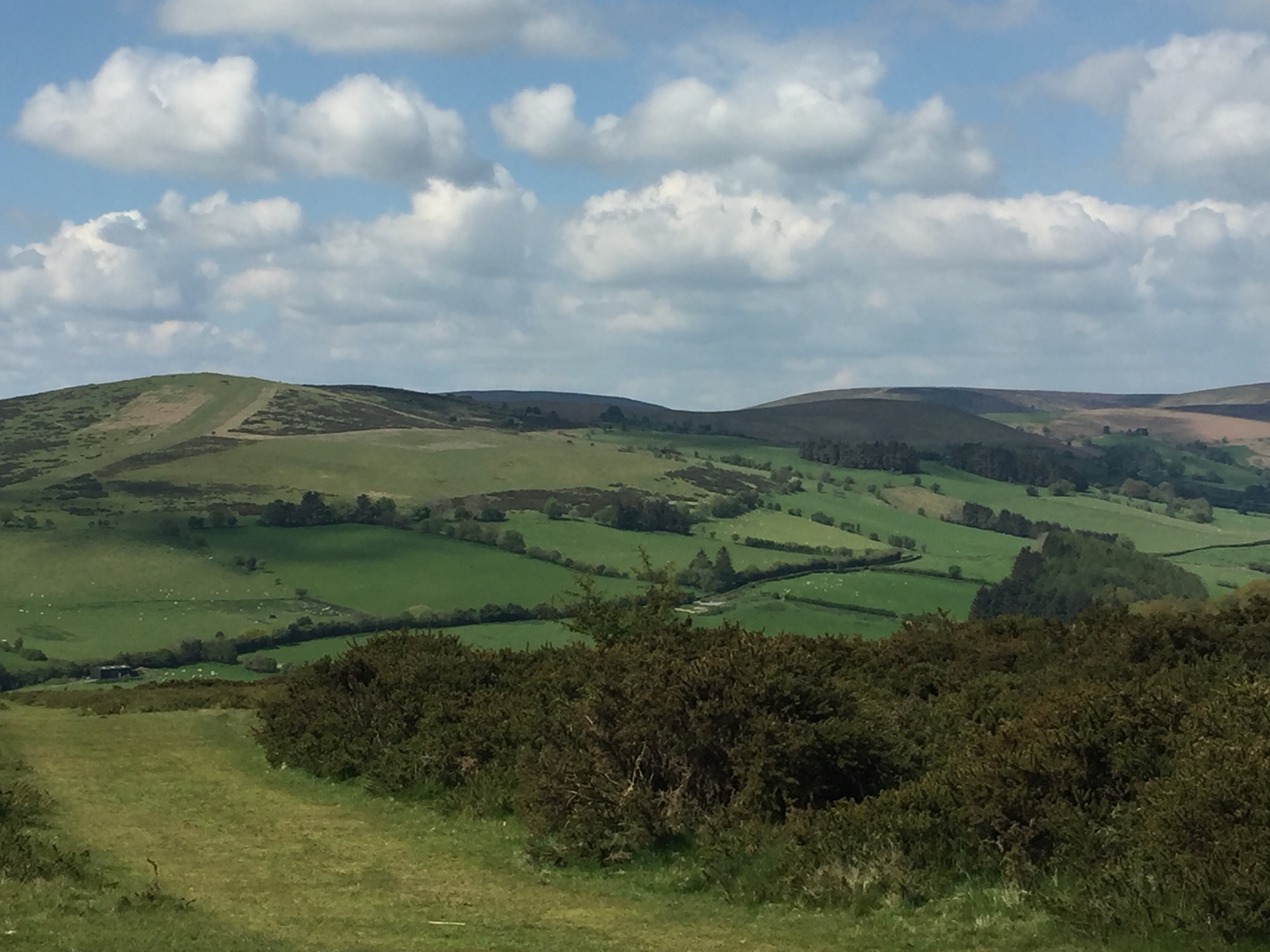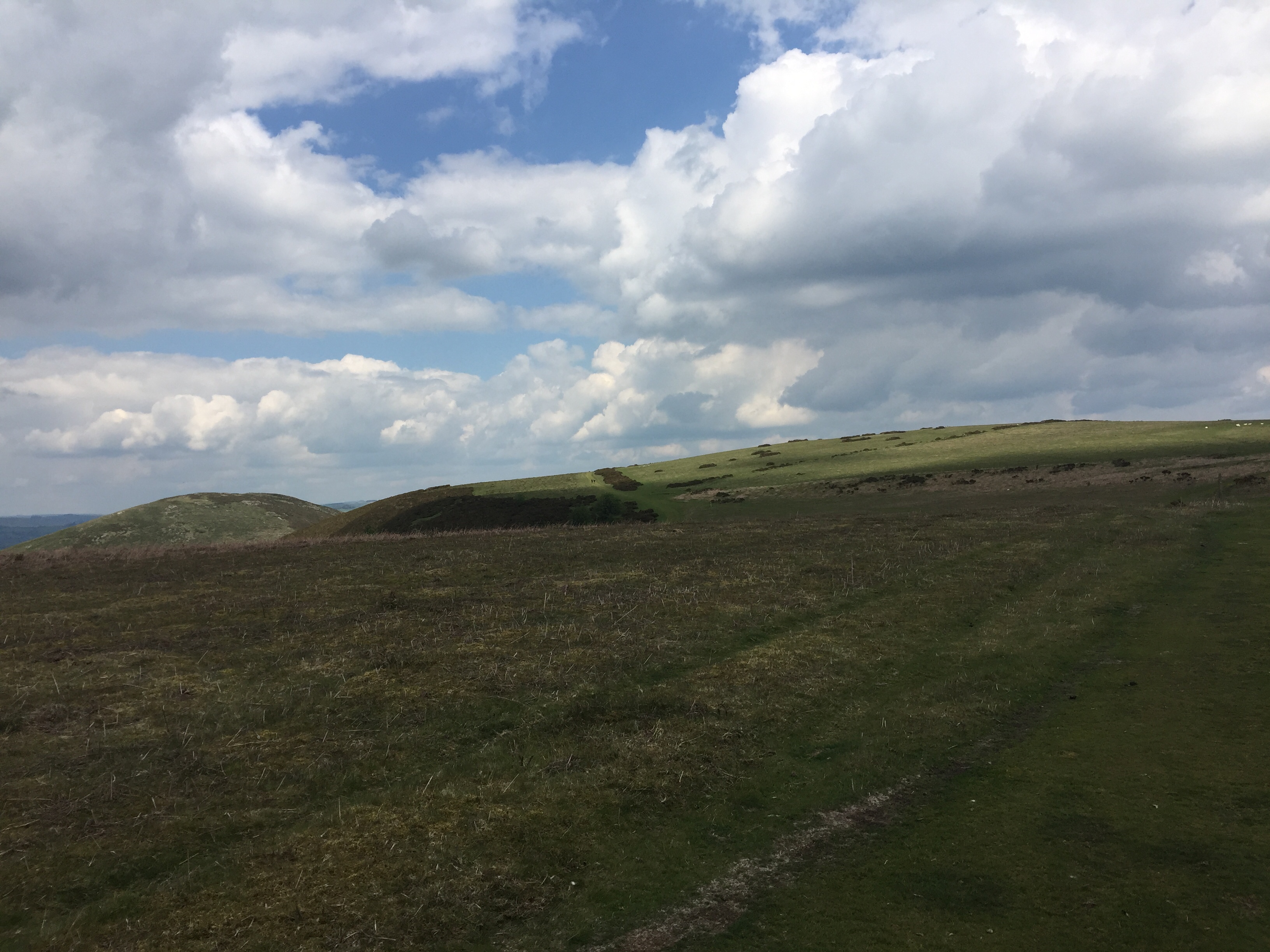 After a short stop for a pork-pie lunch under an oak tree which also provided some canny shelter from an unexpected shower, we completed the pull-up onto the top of today’s signature feature: Hergest Ridge, a long, high hogsback open hill off the north east end of which lies the town of Kington.