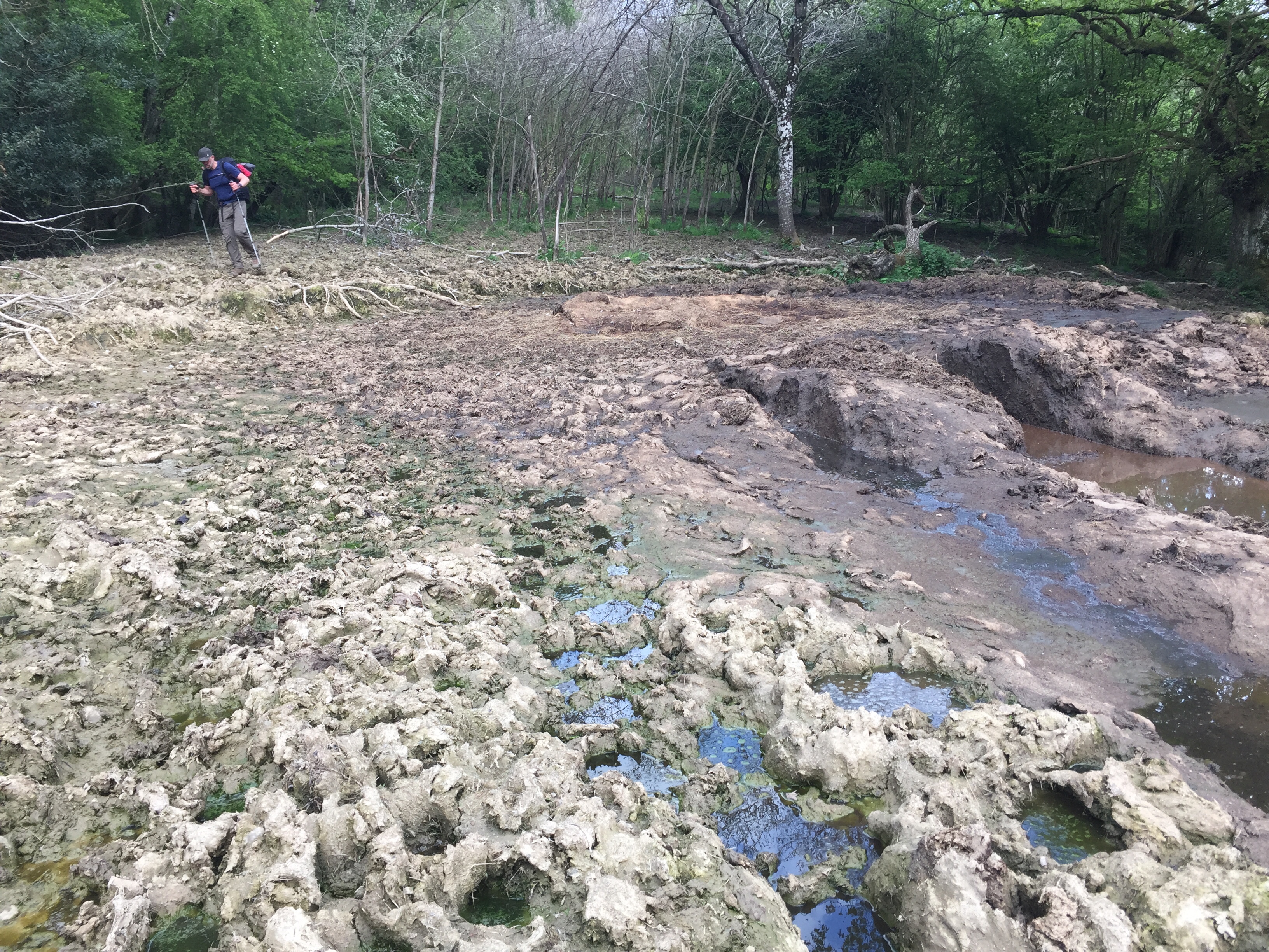 The established rule seems to be that in the last two hours of a walk, there are route problems. We missed a turning off, and took an alternative footpath which looked definite on the map but which had been trampled into oblivion by a herd of cows, dried out, and had left the ground transformed into a solid, uneven charnel house of bone-like baked mud. A little further on, it morphed into a semi-mined quarry filled with pools of stagnant, startlingly green slimy water.