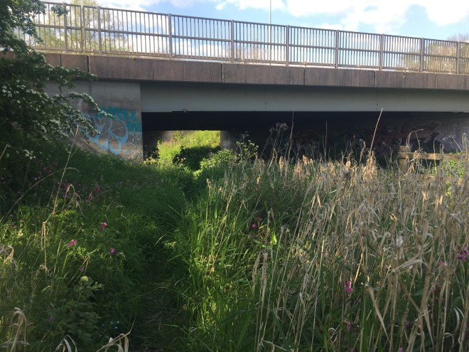 Eventually Stephen got the guidebook up on his phone and worked out that we had to access the underpass from a cycle route. But where was the cycle route? We asked a passing dog-walker. The geolocation had it absolutely right but the path we were looking for was above our heads: the cycle path was up on the A50 flyover.
