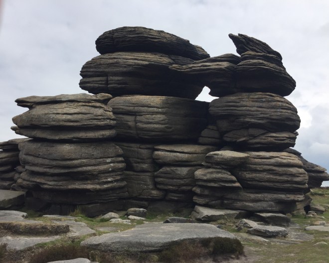 Once on top of the moor we turned right on a track which took us through the heather and bilberry and over unseasonably dry black peat bogs past a succession of dramatic stone outcrops, rounder and more weathered than those on Stanage. A mountain hare crossed the path ahead of us, the first of three we saw today, the size of a small dog and still with patches of its winter white. There were more walkers up here, Instagramming themselves on the Wheatstones, rocks resembling nothing so much as a giant stack of Scotch pancakes.