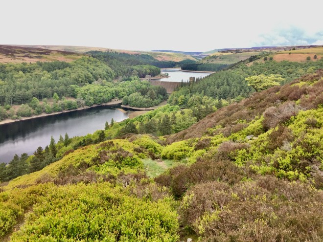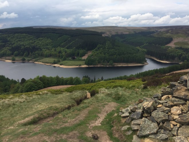 The path zigzagged down through heather and bilberry until we came to the tree line. Still the views were stunning, over the reservoir and out to Kinder Scout: