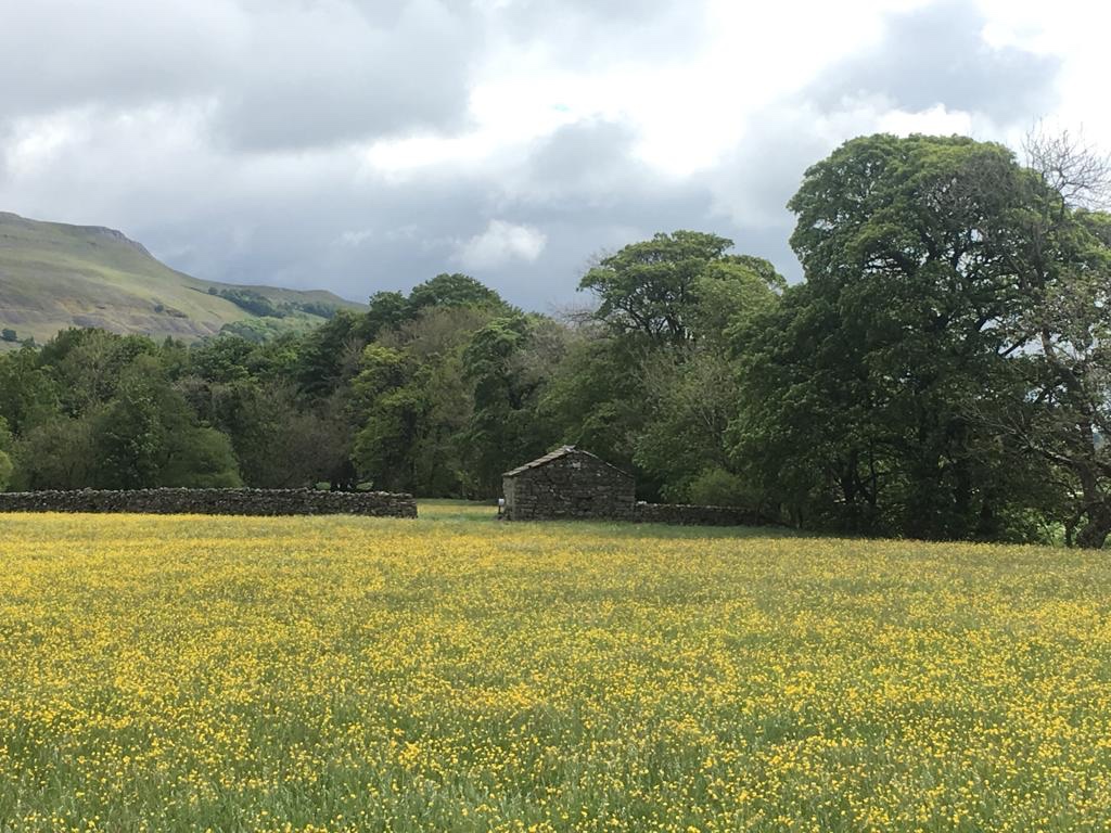 The route took us up a road lined with limestone dry-stone walls bordering buttercup meadows. Dotted around these were the stone field-barns so characteristic of the Dales, and by a grey limestone bridge was the first of many limekilns that we would see today.