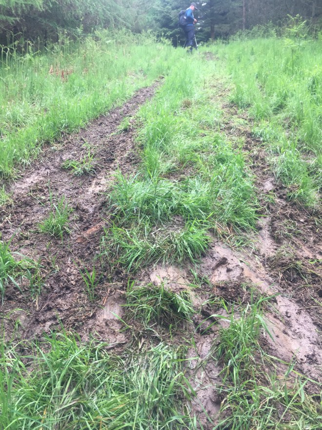 The rain had also turned the infamous pull-up onto Byrness Hill into a broad mudslide, but our poles helped us avoid slipping as we picked our way upwards.