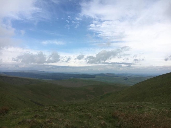 The views from the top were glorious, back the way we had come over vast Kielder, and encouragingly forward to the Cheviot foothills. Breaks in the cloudcover created little gleams of sunshine, promising the chance of a clearer day ahead.