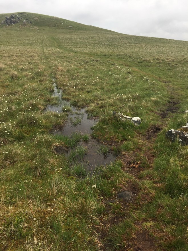 It was on and off with the waterproofs as scudding cloudbanks passed overhead and threatened to break; but it was only ever spitting rain and never amounted to much. The tops were boggy and wet but we chose the rushy cotton grass tussocks for our footing and avoided wet feet completely.
