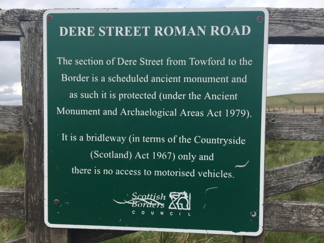 Finally, we reached the gate at Black Halls, with a notice marked with the Scottish Borders Council logo to the effect that Dere Street, the ancient Roman road which we would now follow almost to Jedburgh, was a scheduled monument. Here was our border crossing.