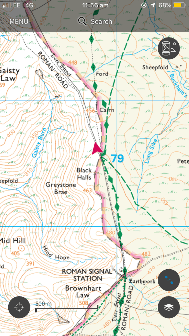 Once on Dere Street following the contour line of the hill we made like Roman legionaries: there is nothing like a Roman road for travelling fast in a straight line, and we started to make up ground to compensate for the relatively slow going over boggy hill thus far.