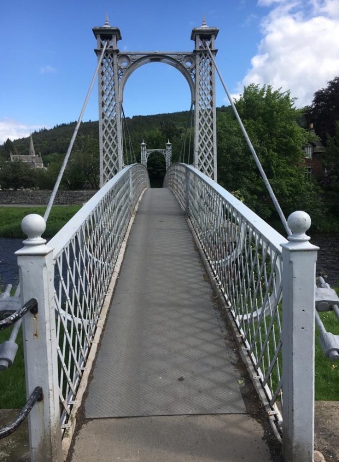 We crossed the wide Tweed over a pretty wrought iron pedestrian bridge, looking upriver to the much older stone bridge, warm and bright in the sun.