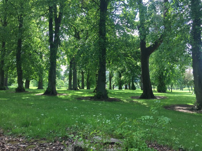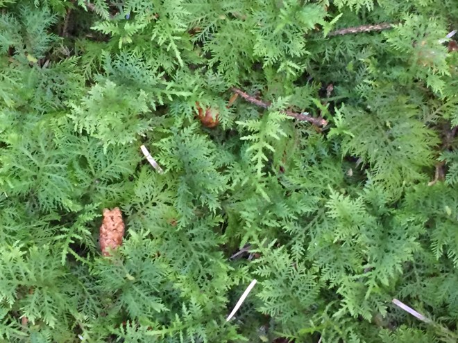 The trees were not so closely planted that light could not filter down, and a fair amount of grass grew between them, creating what I imagine would be perfect conditions for deer (although we only saw the one, crashing away from us), and the permanent cool and damp allowed several different kinds of moss to grow into a micro-forest of its own.