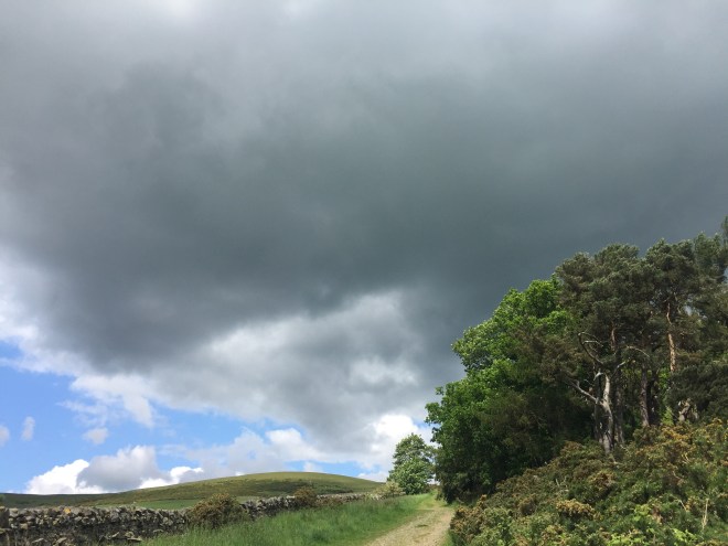 Away to the north were our first sight of the Pentland Hills where we will finish tomorrow. To the right of the track, a stand of Scots pines reminded us of the traces of the Caledonian forest we will see north of Fort William, as we had thought too when we last saw a number of them planted together in one place, way back in Cannock Chase. The shower briefly threatened by the dark clouds was warded off by our rucksack covers.
