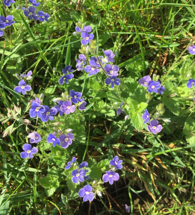 We heard curlews from the tent last night, although none today; it was the lapwings who were with us this morning, standing on the skyline of the stony field next to us with their extraordinary crests and smart plumage. They have two calls: the familiar ‘pee-wit’, and one which incongruously sounds very much like a squeaky dog’s toy. The verge between us and the lapwings shone with germander speedwell,