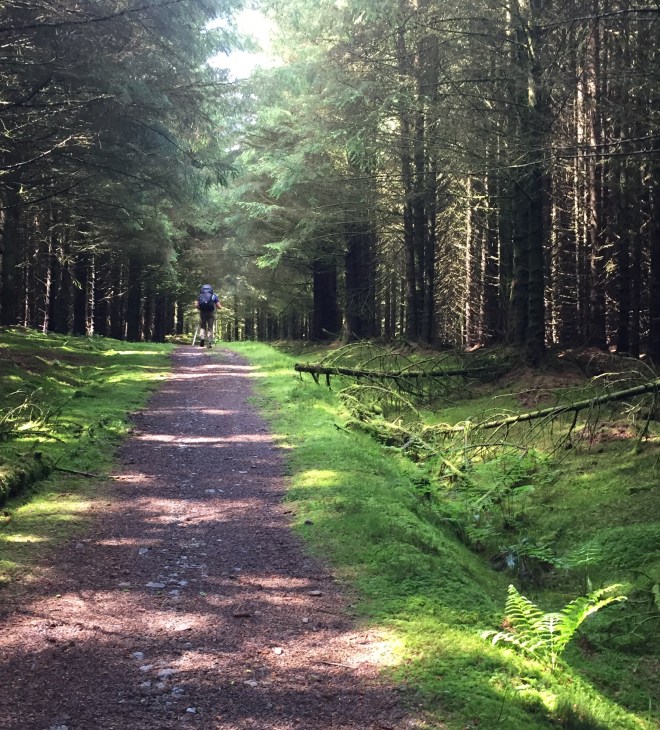The Drove Road traverses the forested Cloich Hills where the atmosphere could not have contrasted more starkly with yesterday’s Minch Moor. This track was enchantingly flooded with sunshine, allowing bright green forest grass to grow, and beds of mosses and ferns. We climbed up the track in spellbound silence, enjoying the cool air and the birdsong high above us. The needle tips of the branches ahead created a filmy, smokey haze quite unlike the ghostly, disturbing wisps of cloud of yesterday.