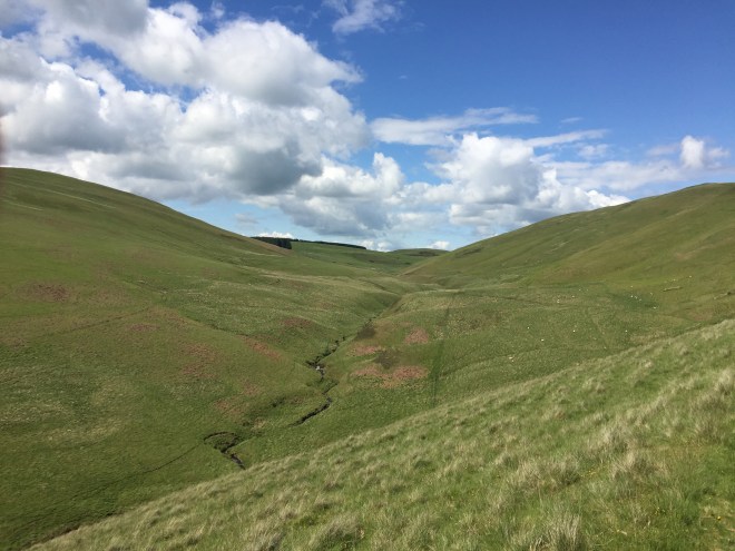 Beyond lay the hill complex of Green Knowe and White Knowe, and Drum Maw and Hag Law, carved out by the Fingland and Flemington burns. Someone had put a bench here right here in the middle of nowhere, allowing us to take the pack weight off our knees and hips and let our attention be swept away by the breath-taking slopes.