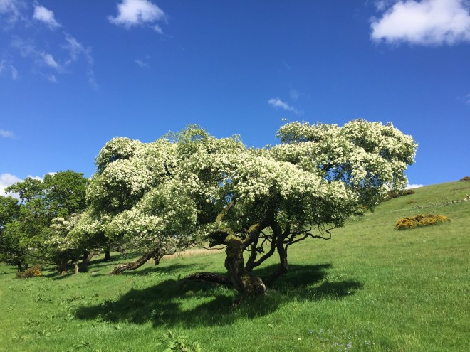 Crossing the col between Drum Maw and Hag Law dropped us gently down into a sandstone valley, past a line of ancient hawthorns with twisted trunks and so much blossom they looked like the heads of elderflowers.