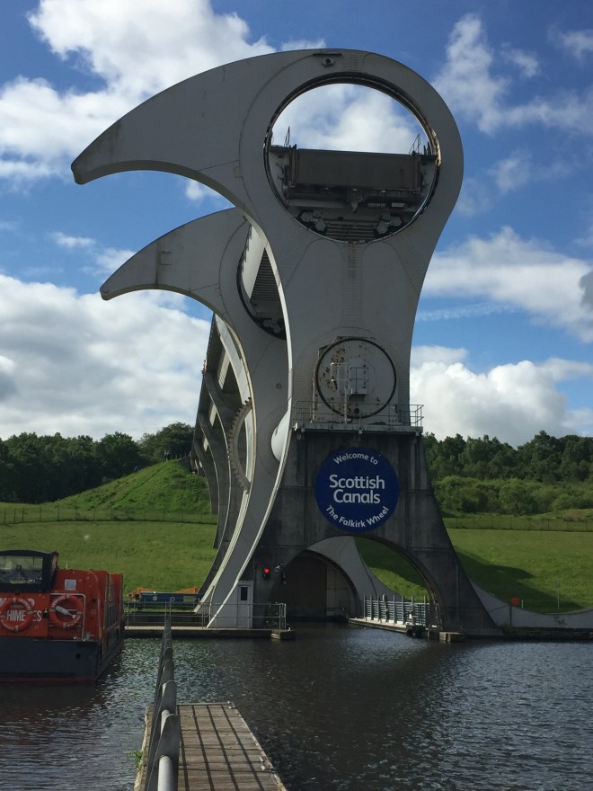 After a relaxed breakfast at the Spoke ‘n’ Boot, during which we chatted to Sandra and her two gorgeous grandchildren, we set off for one of the End-to-End Trail’s most iconic sites: the Falkirk Wheel. Conceived as a Millennium project by the British Waterways Board and designed in 1999 during what must have been an extraordinarily intense three-week creative and design process (after the original designs submitted in open competition were judged to not be ‘ambitious’ enough), this boat lift was to link the Union Canal with the Forth and Clyde Canal again after 70 years of separation. The design brief was not simply for a mechanical means of transporting boats between canals, but was to be a genuinely iconic sculptural statement for the 21st-century. The resulting design is awe-inspiring. It’s very well hidden by trees and the contours of the land until you suddenly, breath-takingly come across it, a stunning sight.