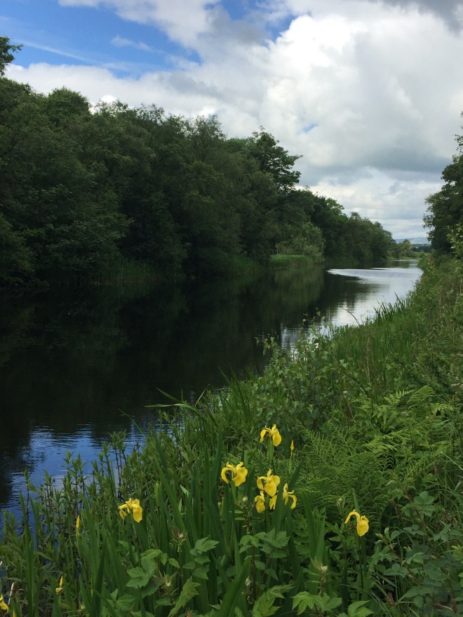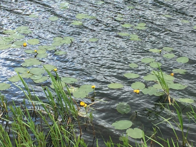 The water margins are covered with bulrush and flowering yellow flag iris, and waterlilies, just coming into bloom, abound.