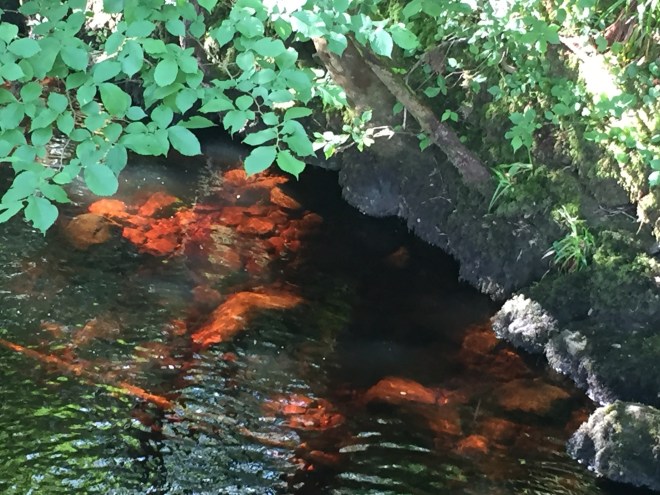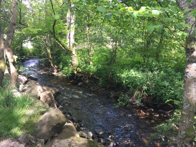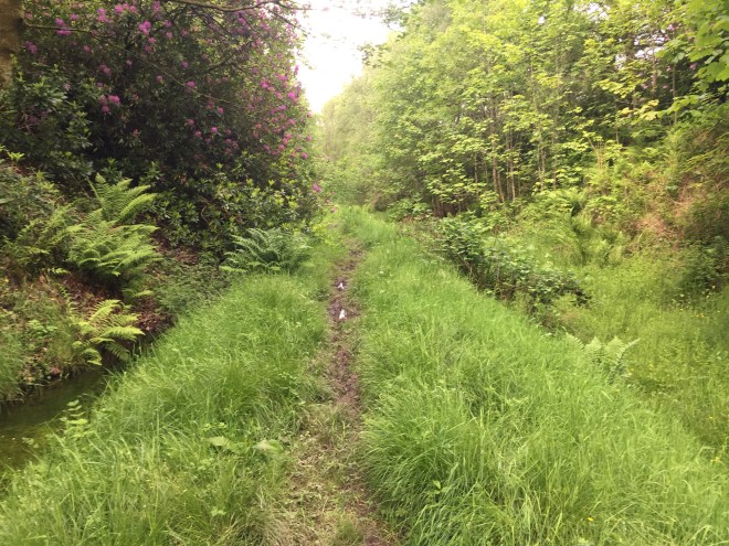 The John Muir Way continues on a cyclepath for a couple of hours after leaving Lennoxtown, and the woodland was dark under sticky sycamore trees. The stream we followed was also dark: peaty, the colour of stewed tea, a tantalising reminder of the whisky produced in the local distillery.