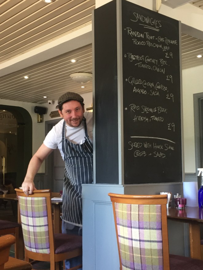 In Strathblane we followed our rule of asking for local advice and were directed to the Kirkhouse Inn, where we whiled away half an hour chatting to talented chef Scot: his scones were truly excellent, and we were more than sorry not to have been able to sample his rainbow trout and crab sandwiches. It felt totally relaxing to chat about local sources of salmon and trout, and hear about the smokeries in the area, and when he disappeared back into the kitchen after having filled the specials board with mouthwatering items, we carried on talking to Vince, seated at a barstool with a pint in front of him; we compared notes on our favourite long-distance paths.