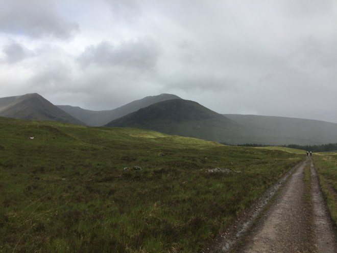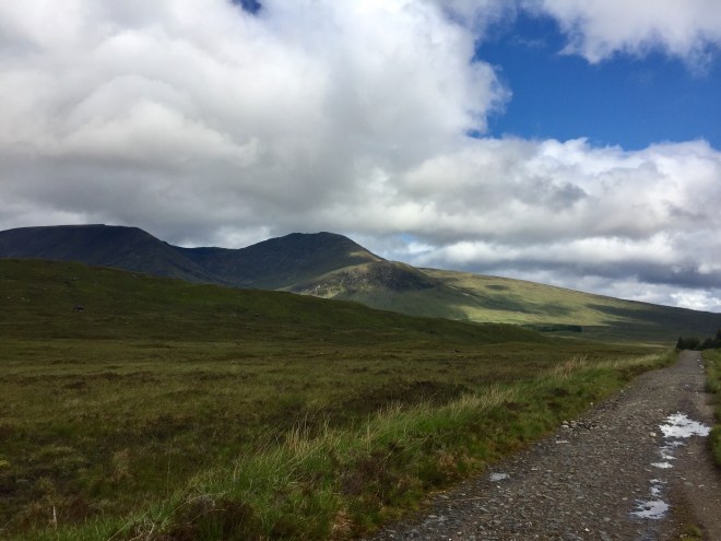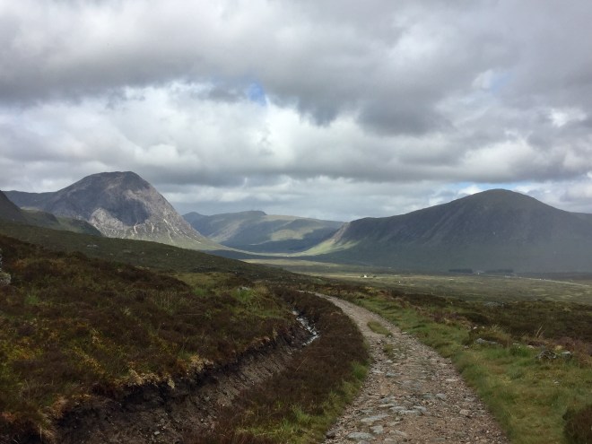 The track climbed steadily – now with unforgiving and uneven cobbles rather than the gentler bed of gravel, sadly. To our left were a suite of imposing hills made of a complex mix of ancient igneous rocks, quartz, marble, and other hard, slow-to-weather matrices. To our right the land swept down, and away to Rannoch Moor with its myriad little lochans.
