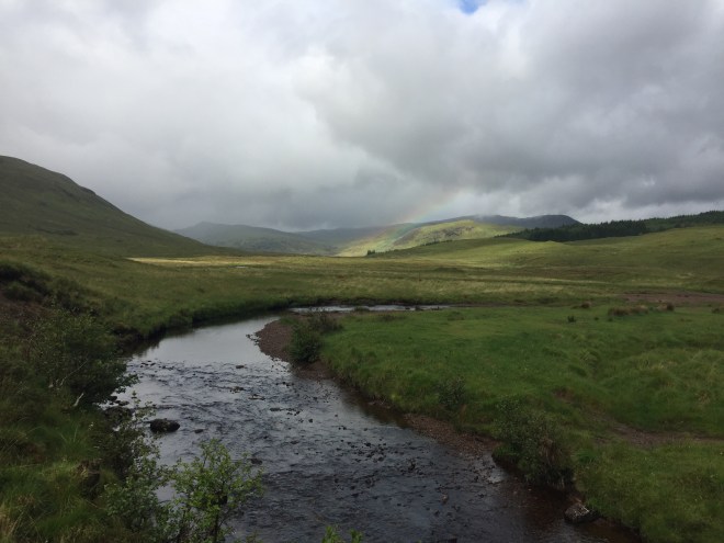 Shafts of sun lit patches of hillside through the clouds of suspended water droplets, creating a low rainbow on the far side of the Allt Tolaghan as it fed into the loch.