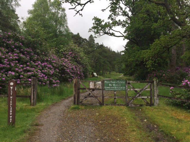 A gate at Forest Lodge took the track out through invasive rhododendrons out onto the parliamentary drove road to Glencoe, designed by Thomas Telford in 1803 when he was commissioned to survey the military roads. He engineered the new roads intentionally to take a gentler gradient, and with up to 15 inches of gravel to protect the hooves of the sheep and cattle being driven south.