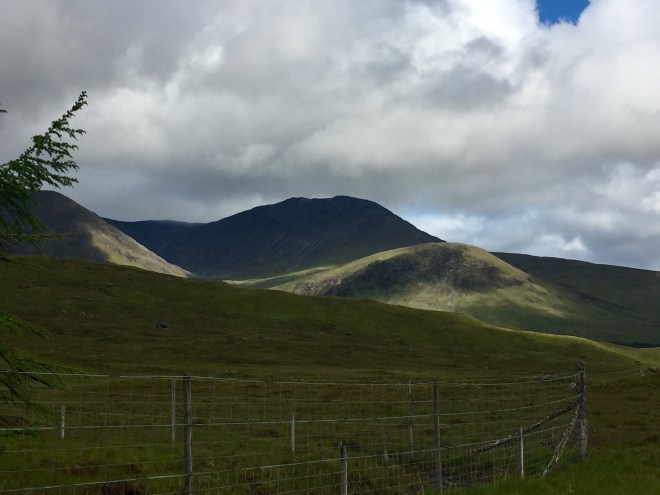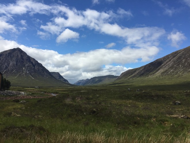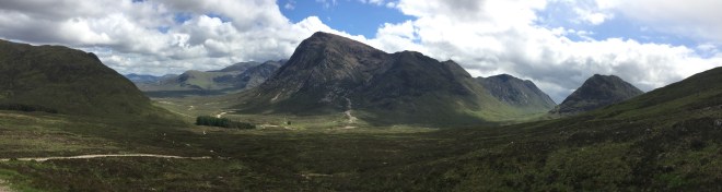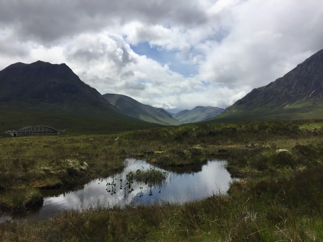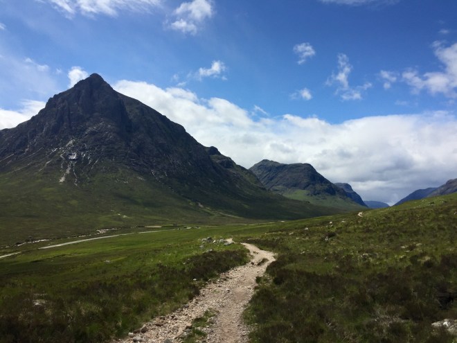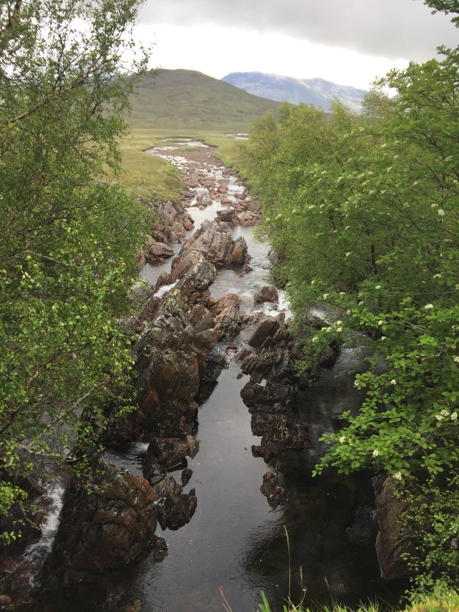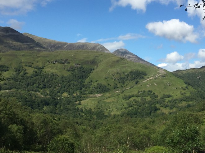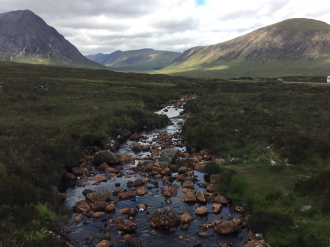 The military road which we joined some way back runs parallel but at a distance from the A-road, and even though we were relatively close to the traffic it was effortlessly swallowed up by the landscape as the first of Glencoe’s three sisters came into view.