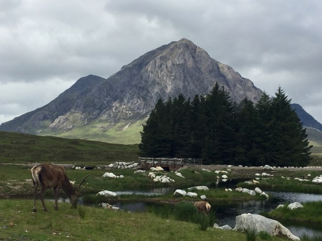 By lunchtime we had reached the revamped Kingshouse Hotel, landscaped to create photo opportunities complete with a semi-domesticated one-antlered stag; I thought he was quite photogenic, although I couldn’t bring myself to include in the picture the hotel employee in full Highland dress. And of course I had to wait for a gap in the A82 traffic for the full Insta-effect.