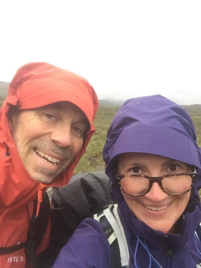 We stood for a while on the minor road comparing notes and discussing our intentions. Our main objective was to get to Invergarry as soon as possible, to dry out the tent, and our boots, and begin the process of re-routing ourselves. We were therefore waiting for Cathy to come and pick us up in her taxi and convey us to the Glen Albyn Lodge B&B. (As our friend from Loch Tummel texted later that day, “A taxi?” To be said in your best Lady Bracknell “A handbag?” voice). David’s intention was to walk 13 km along the road instead. As we were chatting the still air brought out the midges and we had occasion to give our midge headnets their first outing. A friend of our son, on seeing the photo, commented, “What, are they bankrobbers?”