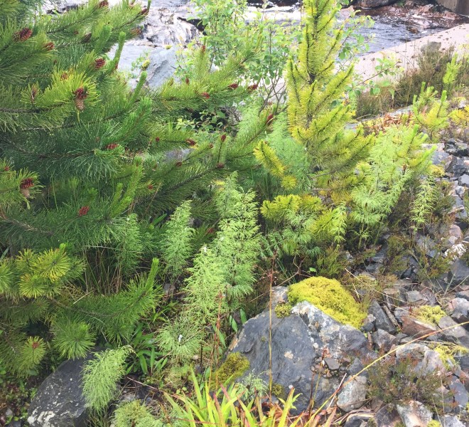 Instead of the very purposeful problem-solving walking we had done in the second half of Monday, we were now noticing more and more what was around us. Down by the bridge of a hydro-dam a prehistoric forest in miniature was created by branched horsetails and tiny conifer saplings.