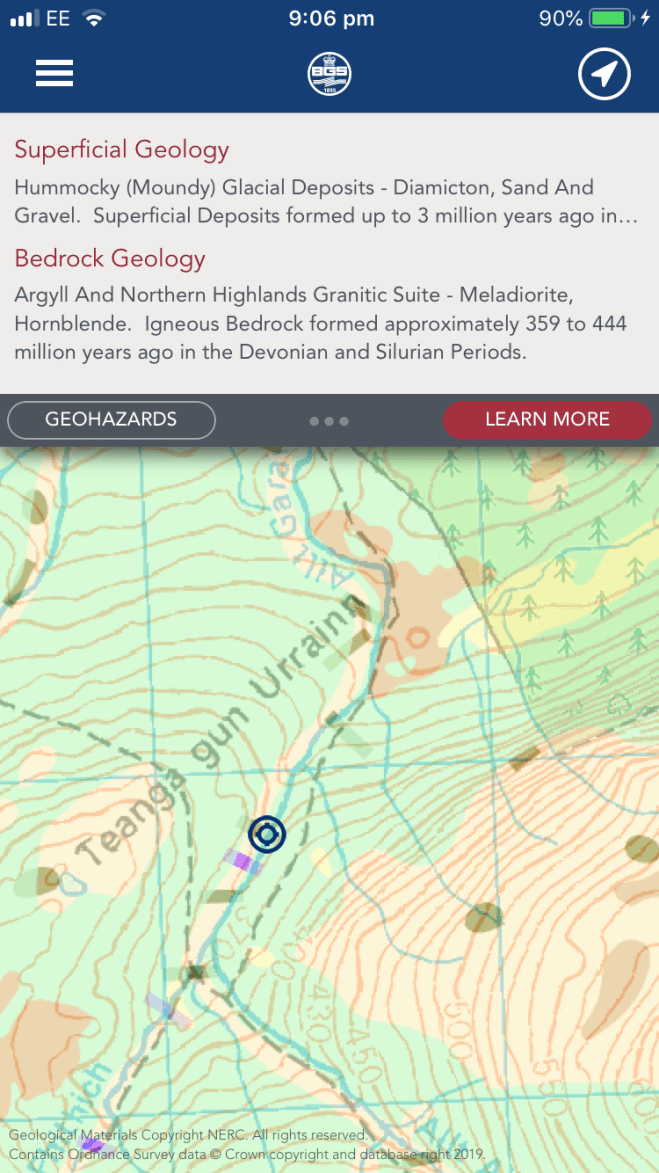 At about 7.30 the rain had stopped for long enough for us to take down the tent that had sheltered us for two nights and a day. We also took a moment to appreciate the small but effective near-platform of rock standing slightly above the rest of the bog. It had been a good place. I checked the geology app and saw that right exactly where we were, there was an intrusion of much harder igneous bedrock, meladiorite and hornblende, in the surrounding sea of sandstone.