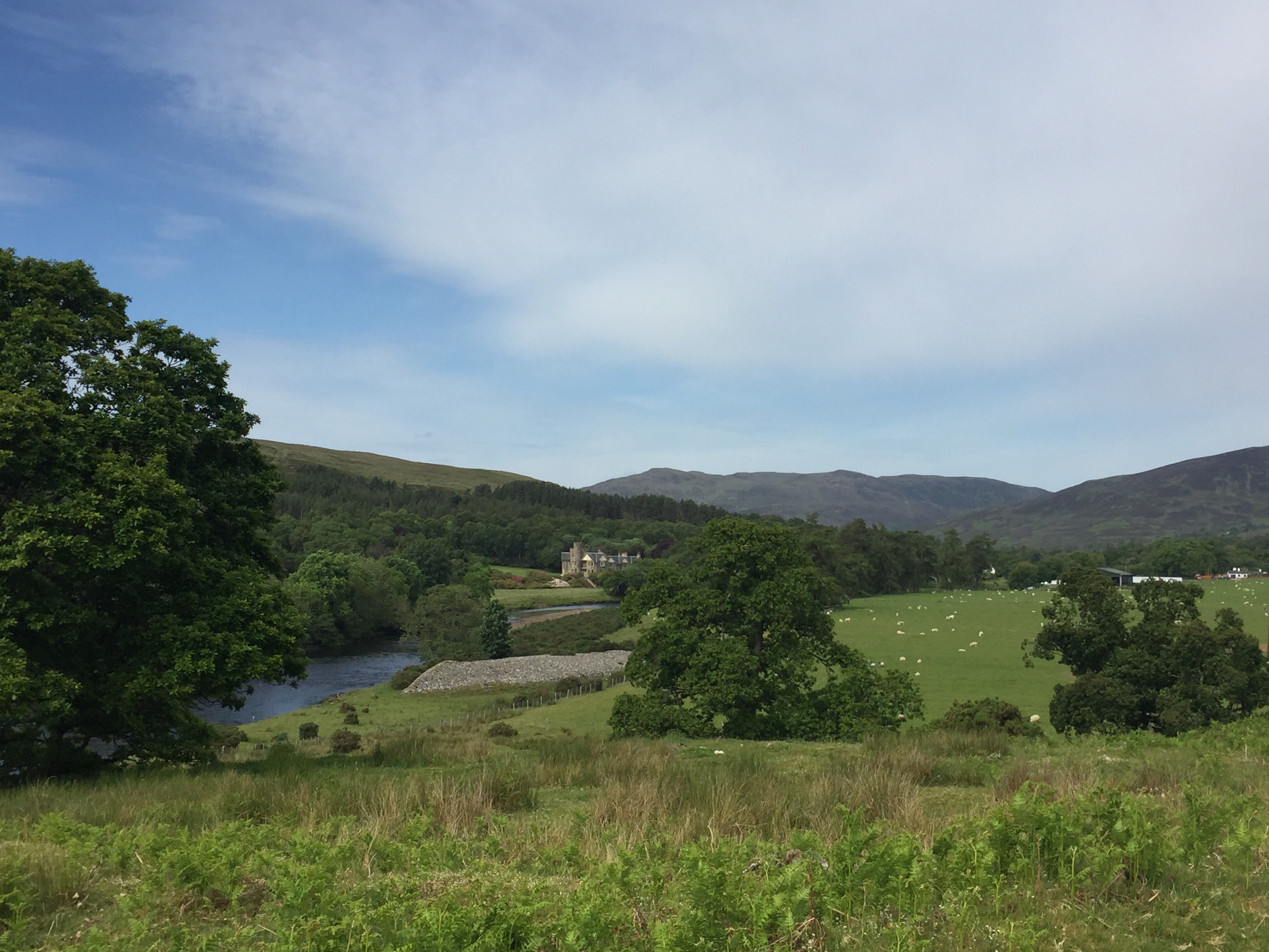 The road took us swiftly down the glen through land now largely given over to agricultural purposes. Small herds of cows and sheep grazed, the lambs now fat and developing muscle, and fields where a silage cut awaited baling. The river wove through the glen, now closer now further away, a constant aural and visual presence.