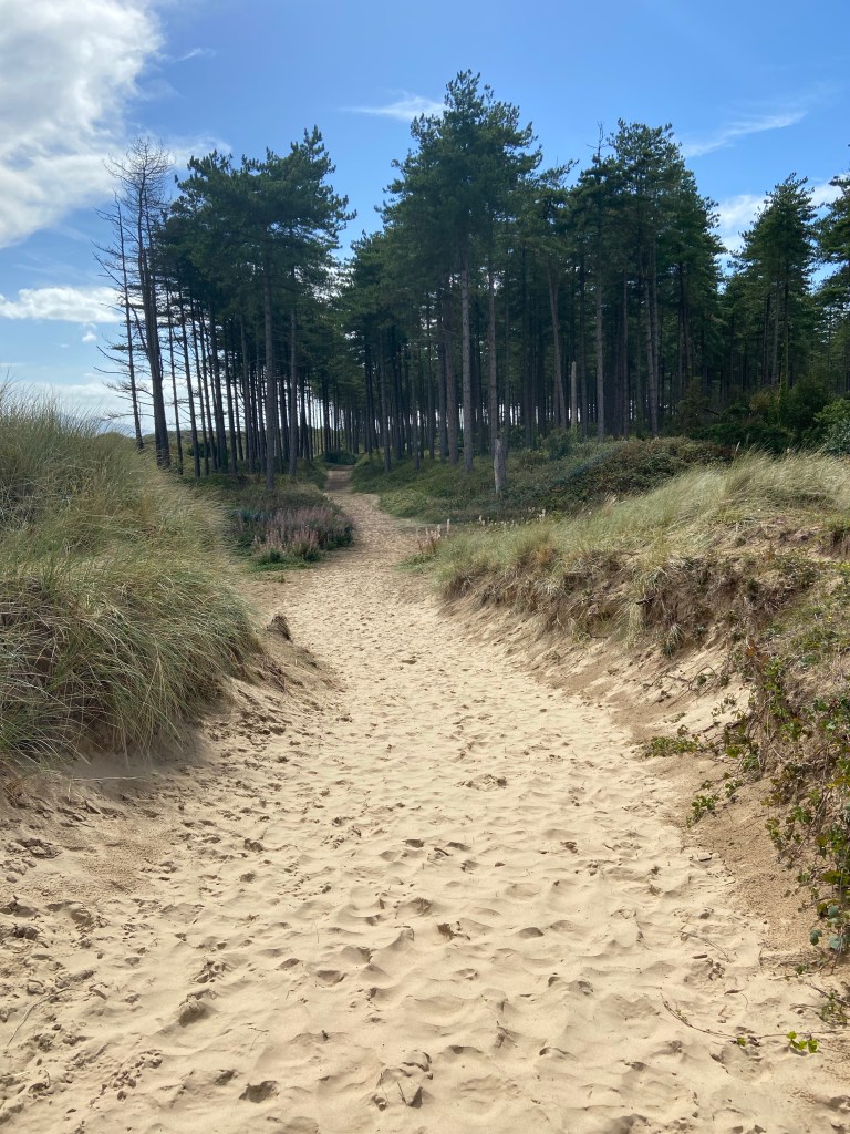 Even though I was tiring significantly, I was pleased my knee was holding up. The Forest is huge, planted mainly with Corsican pines which fill the air with a distinctly Mediterranean scent. Some are huge – planting began in 1947 as part of dune stabilisation efforts and latterly as the most important red squirrel conservation site in Wales (did I see one? I did not… although Stephen did, fleetingly, when he came here for a forest trail run on Saturday). To respond to climate warming they are now thinning the pines and encouraging a much greater diversity of trees, bushes and understory species, to encourage resilience to unpredictable weather and climate. It is very beautiful.