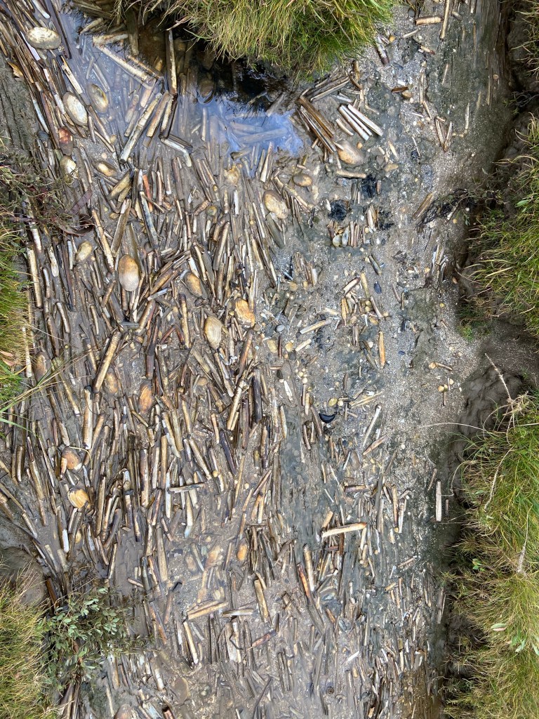 and, nearer the shore, saltmarsh hags covered in glasswort and sea purselane, with an unbelievable number of razor clams washed up in the creeks between them.