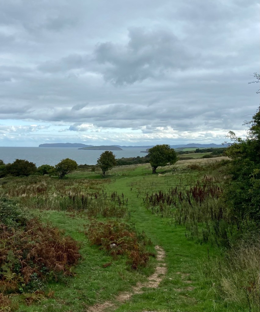 I have loved my two walks with him, and our extended conversations, and indeed all the time I’ve spent over the past two weeks with his family. They’ve been so generous with their hospitality and their logistical support, and this walk would have been much more gruelling and uncomfortable without them. I turned north to climb off the beach and up around Bwrdd Arthur, the plateau at the top of headland known as Arthur’s table.