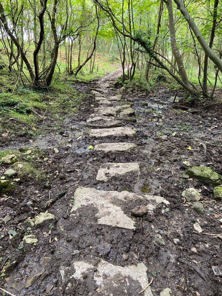 At the top of the hill the path disappeared into a small wood through which the path continues over wet ground on helpful stepping stones over the cow wallow.