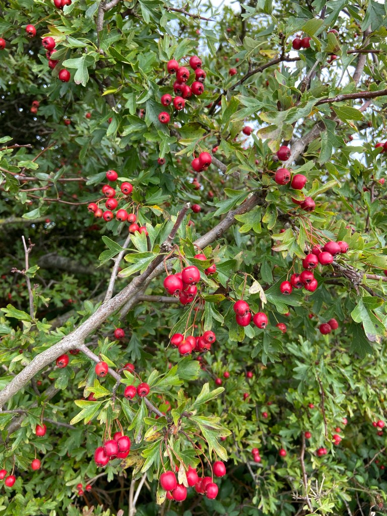 lead down to rough pasture enclosed by sizable scrub, in some places proper woodland with hazel, hawthorn, sallow and ash, In other places more open scrub of gorse and blackthorn breaks. The air was alive with a net of birdsong lying over the deep bass boom of the incessant sea at the bottom of the cliffs. cliffs. I was nearing the National Trust reserve of Fedw Fawr, a SSSI ‘for its geological, botanical, ornithological and marine biological features‘. It definitely felt more autumnal than it has hitherto, and I was noticing more berries on the hawthorn, more ropes of scarlet bryony, blacker elderberries, and the first of the hazelnuts emptied out by mice or perhaps even red squirrels.