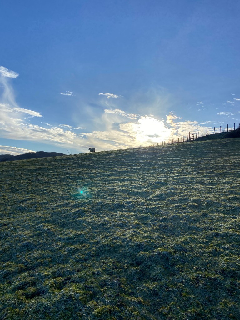 Once into the sheep fields, I climbed up over a mixture of turf and thick, icy moss, each axis rimed with sparkling ice where the sun had not yet melted it.