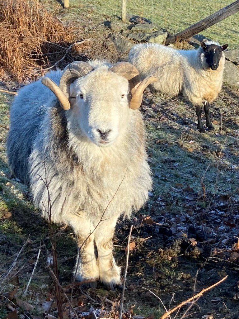 A curious, symmetrically-horned ram watched me with its disconcerting slotted eyes as I negotiated a stile next to it. Its fleecy legs seemed better adapted for life outdoors in February than those of the skinny creature behind it.