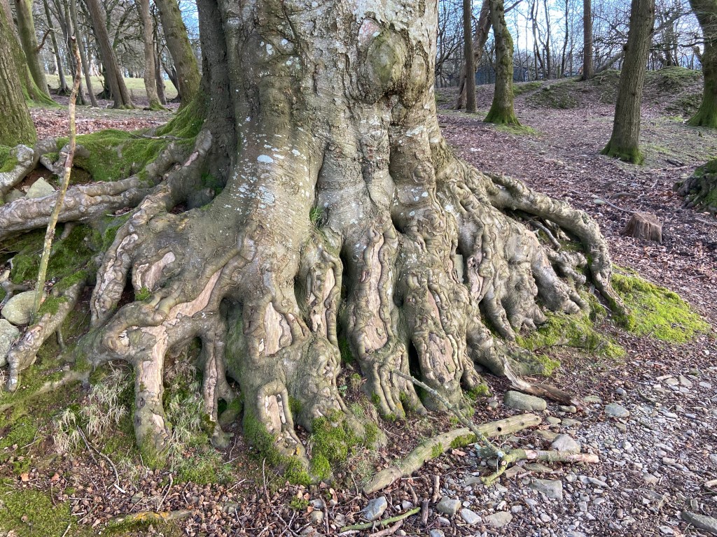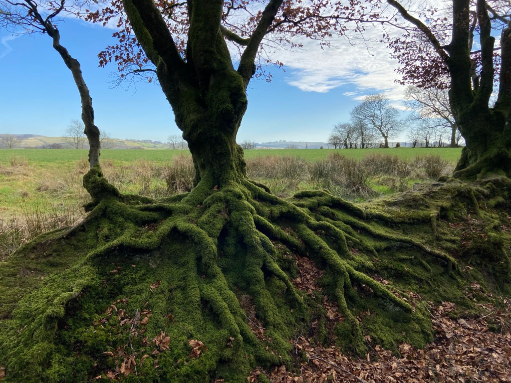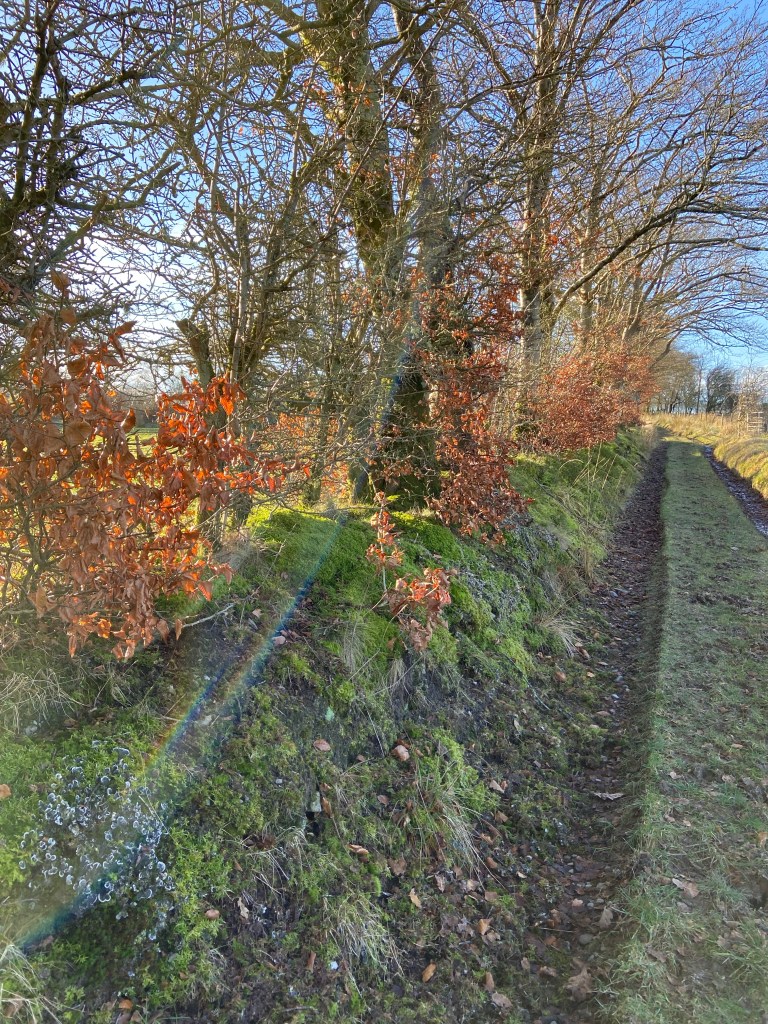 The barrenness of the winter vegetation casts more attention on the shapes of the trees: the path along the edge of Longwood is lined with moss-covered beech trees, forming a kind of processional avenue leading up to the first of three Iron Age earthworks standing in a line, marking the approach to Lampeter.