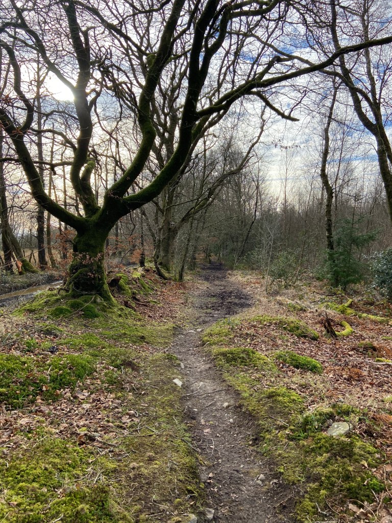 My path was an ancient l right of way, a rising track bordered on one side with beech trees, buds tightly furled against the coming of the spring, and the low winter sun flickering through the bare branches as I moved.
