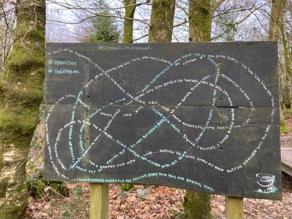 There are green woodworked tables and benches in memory of local people. Unexpected hand-painted boards of poetry and quotations.