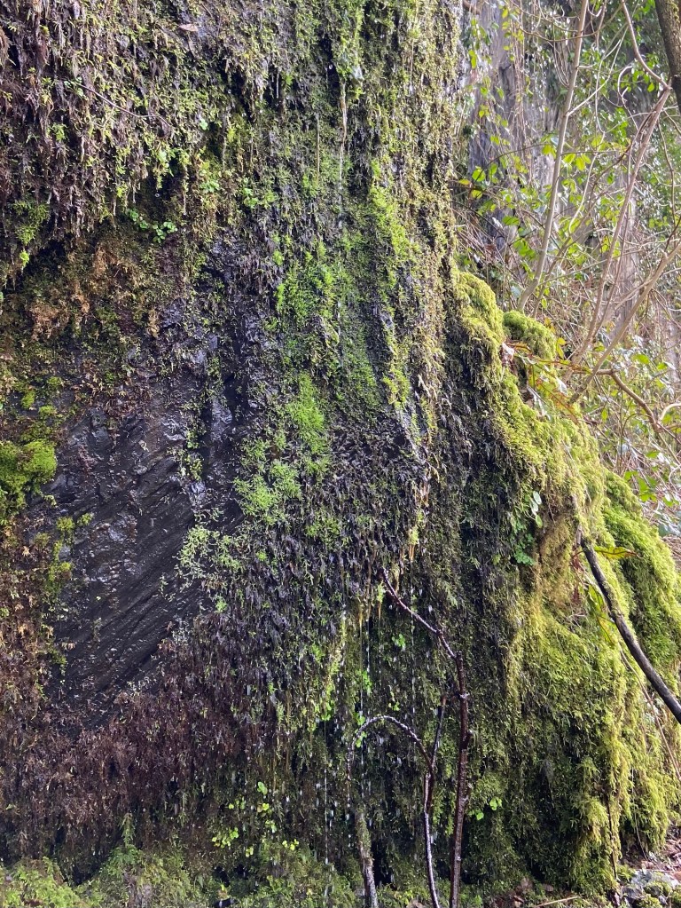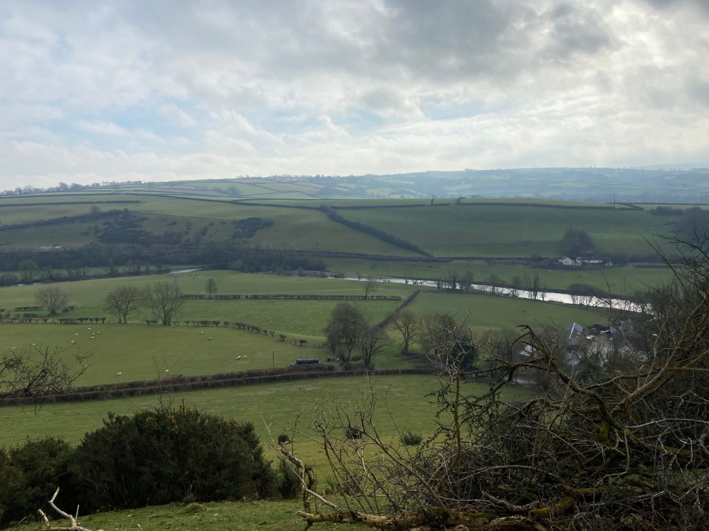 Counterintuitively, at the bridge the road doubled back on itself. To avoid the 4 km trek into Newcastle Emlyn, the path takes a wide berth, and another high one, too. Off the road, up I climbed one more, scuffing through crunchy oak leaves, which here were mixed liberally with bits of moss which blackbirds and wrens have started to pull out of the banks with their beaks for their nests.