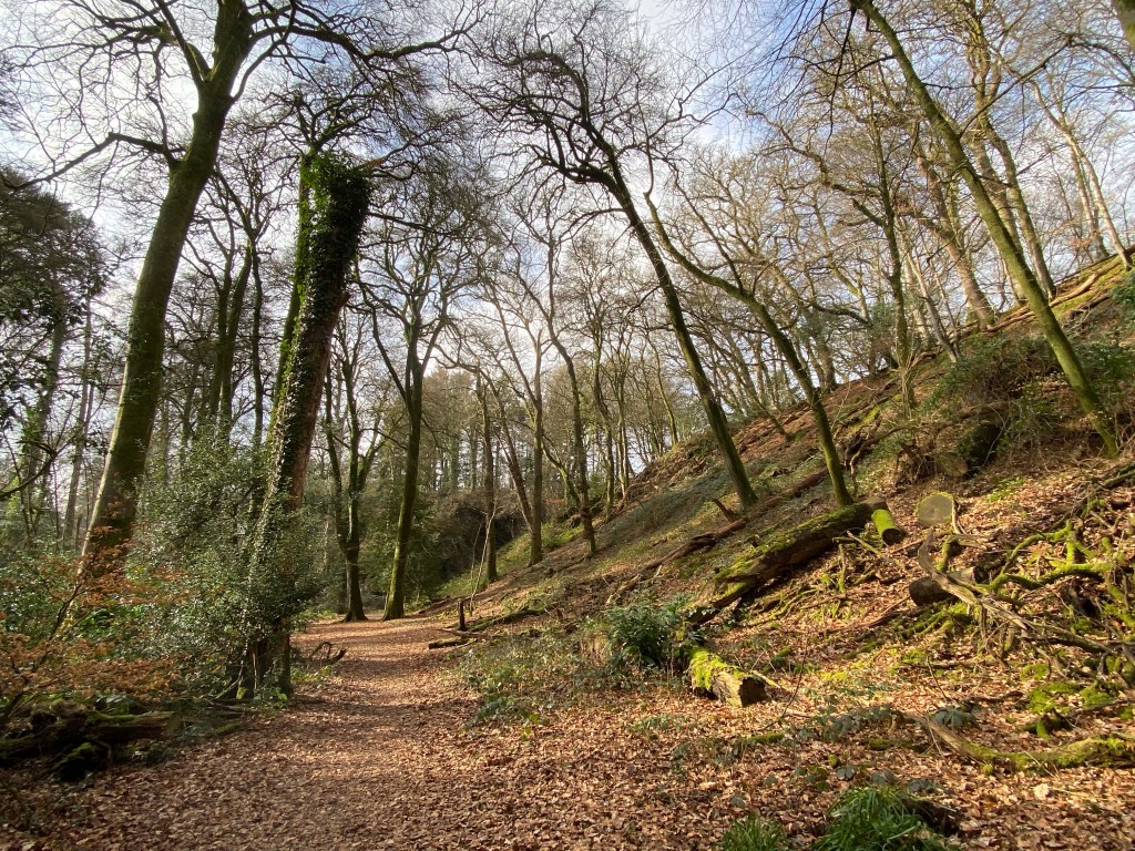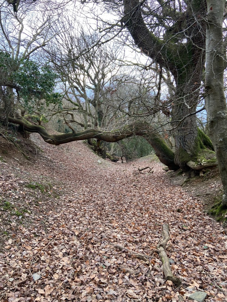 More tracks, up and again down, but time was so tight now I just briefly noticed now bedrock underfoot, then stones laid as cobbles, gnarled old oak branches seeming to tie themselves in knots around the track,