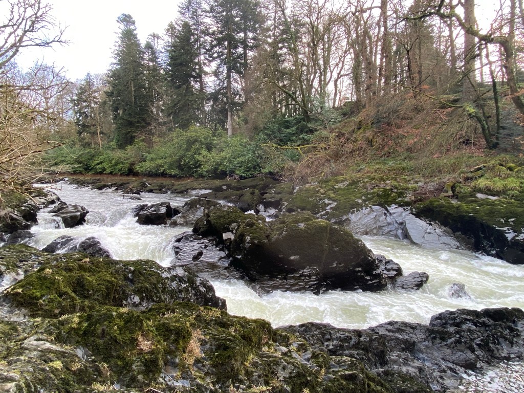 I picked my way over rocks and clumps of wood rush, trying to avoid treading on the mass of sprouting snowdrops to watch the water being forced at high-pressure through the rocks.